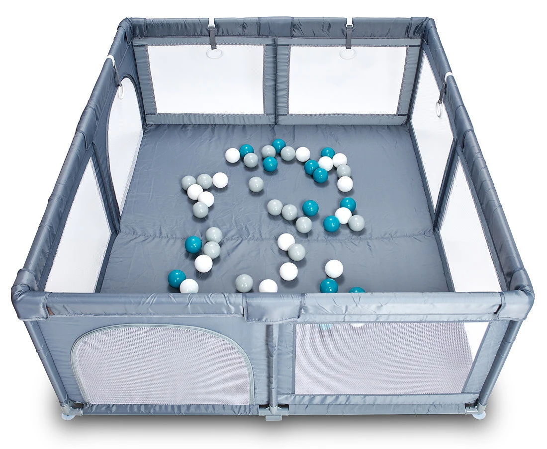 De ballenbak heeft mesh-stof zijkanten, zodat je je kindje altijd goed in de gaten kan houden. Hij is 150 bij 180 cm groot, genoeg speelruimte dus! De 48 meegeleverde gekleurde ballen maken het helemaal af. Uiteraard ook zonder ballen te gebruiken, zo creëer je een veilig plekje om te spelen of te liggen.Â