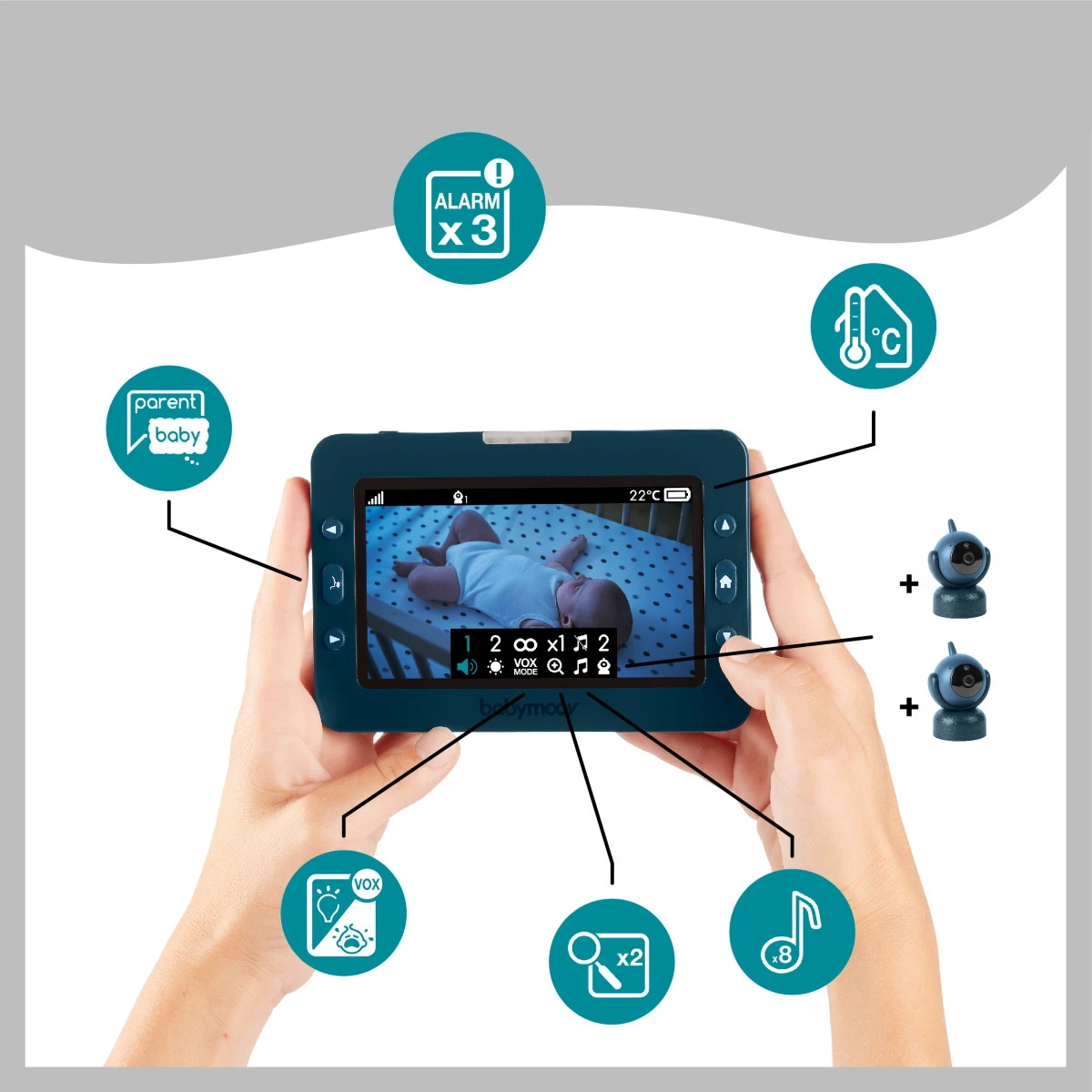 De Babymoov Yoo Master Plus Beeldbabyfoon is een echte master onder de babyfoons! Deze digitale videobabyfoon is eenvoudig in gebruik en gemakkelijk te bedienen via de ouderunit. Je houdt je kleine goed in de gaten met het ruime 5 inch (12,7 cm) beeldscherm, zowel overdag als ’s nachts dankzij de infrarood camera en automatische nachtmodus.