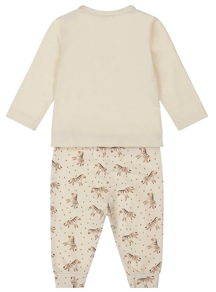 Het pakje is off-white van kleur en heeft een superschattige print met zebra’s. Dankzij de drukkertjes kun je de kleding gemakkelijk aan- en uit doen. De set is gemaakt van comfortabel en flexibel materiaal, zodat je kindje vrij kan bewegen.