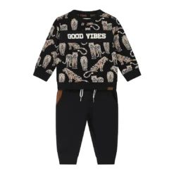 Met deze schattige 2-delige set van Dirkje is je kleine warm én leuk aangekleed! Door het lange broekje en de trui met lange mouwen heeft jouw kindje het niet snel koud! Het truitje heeft een leuke print met tijgers en de tekst die zegt: “Good vibes”.