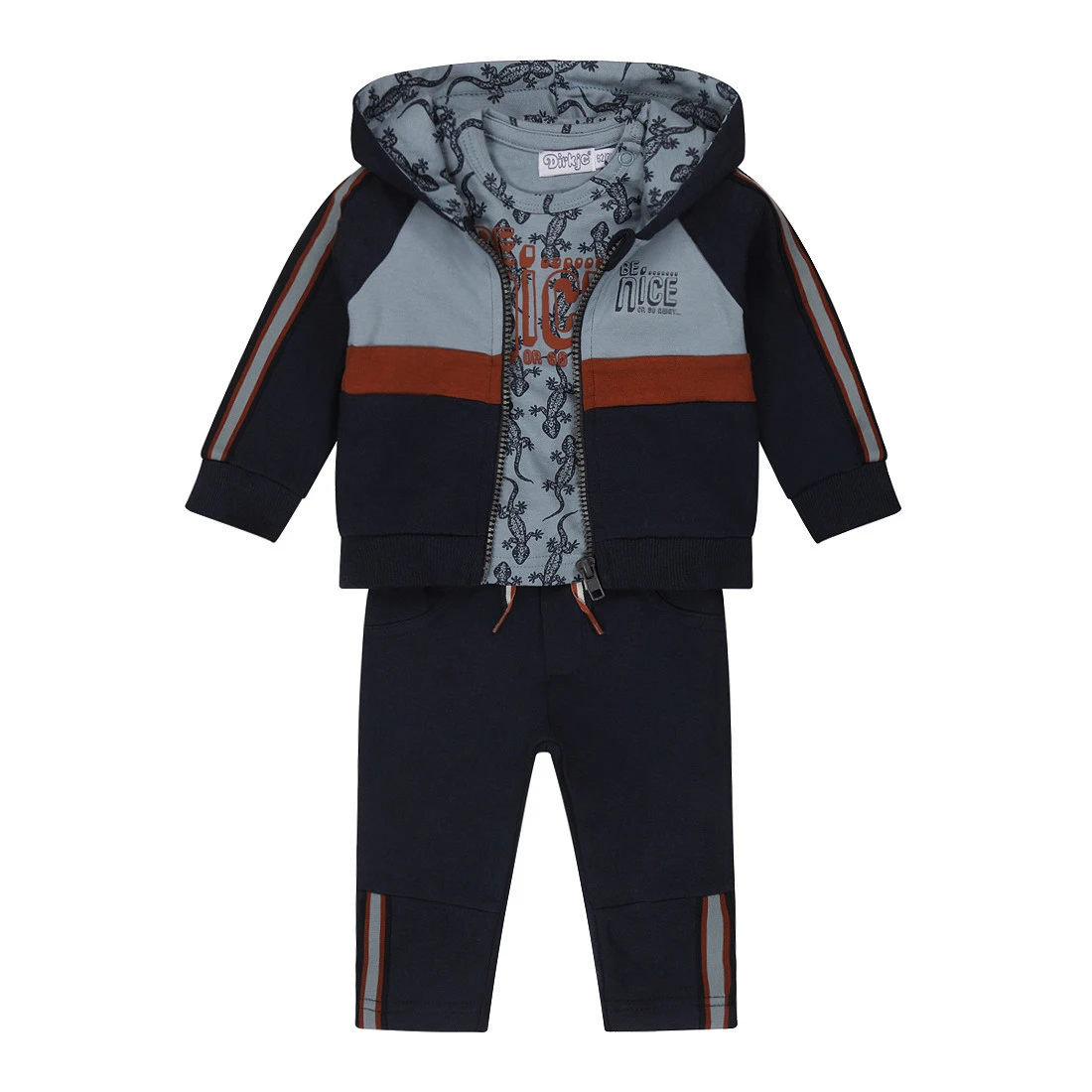 Wauw! Met deze leuke 3-delige set van Dirkje is je kleine warm én schattig aangekleed! Door het lange broekje en het vestje heeft jouw kindje het niet snel koud, wanneer je kleine het warm krijgt kan het vestje uit. Het truitje heeft lange mouwtjes en een salamander print.