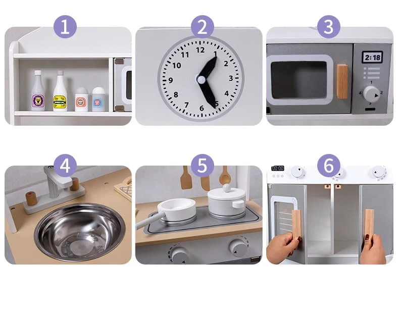De deurtjes van de kastjes en de oven kan open en dicht, de tijd van het klokje kan verzet worden en er kan aan de knoppen worden gedraaid. Het lijkt net echt!