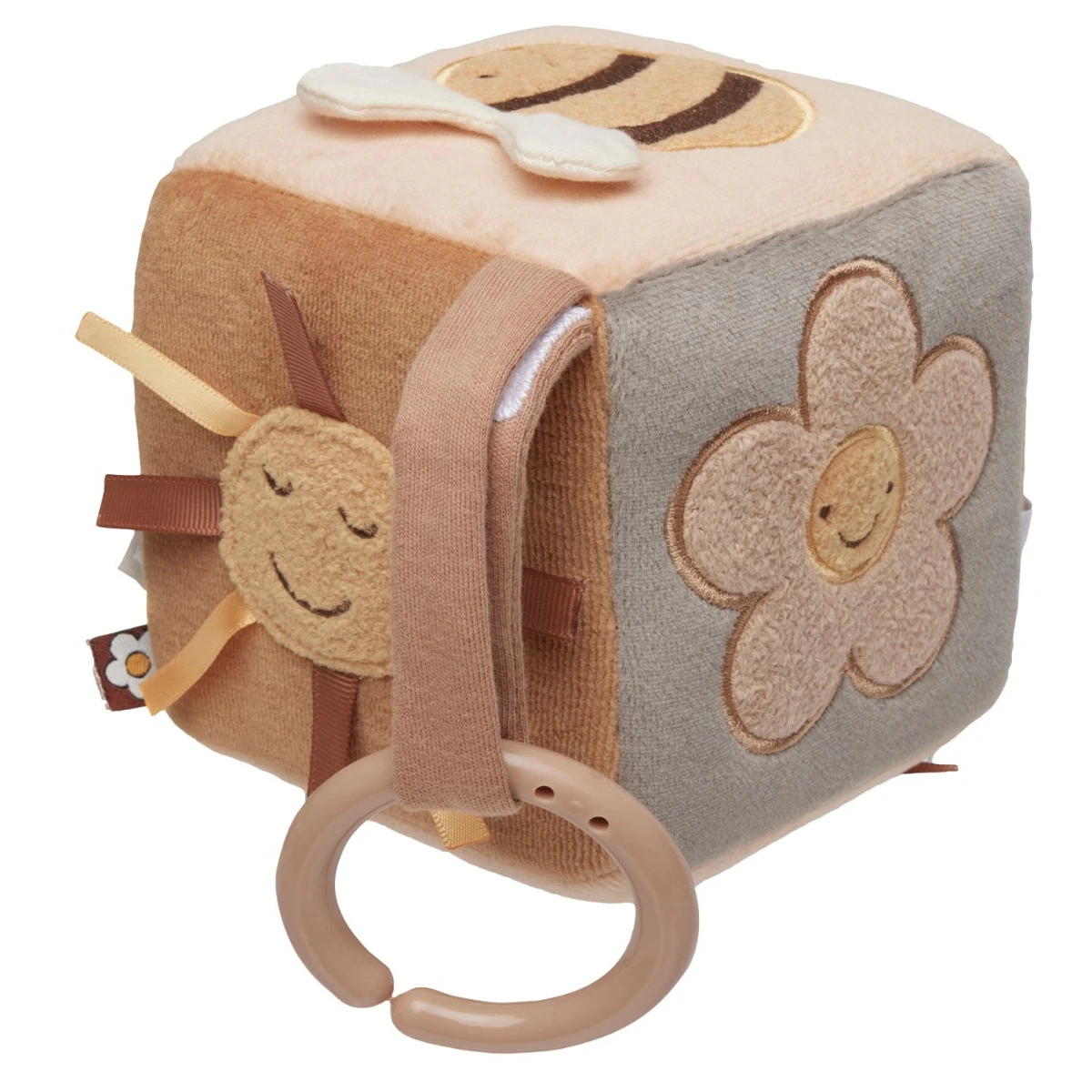 De kubus heeft knisperende elementen, verschillende texturen en figuurtjes, kleurrijke labeltjes, een leuke babyspiegel en een handig koordje met plastic ring waarmee je hem makkelijk vastmaakt aan bijvoorbeeld de kinderwagen of de box. De kubus is 12 x 12 x 12 cm groot en is gemaakt van 100% velours en gevuld met 100% polyester fibre fill.