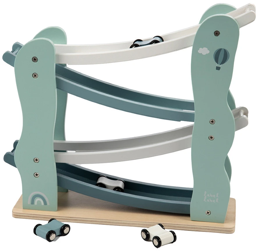 Urenlang speelplezier met deze houten autobaan van Label Label! Zet de autootjes één voor één bovenin de autobaan en laat ze racen naar beneden! Er worden 4 autootjes meegeleverd, zo kun jij in de gaten houden welke als eerst beneden is.