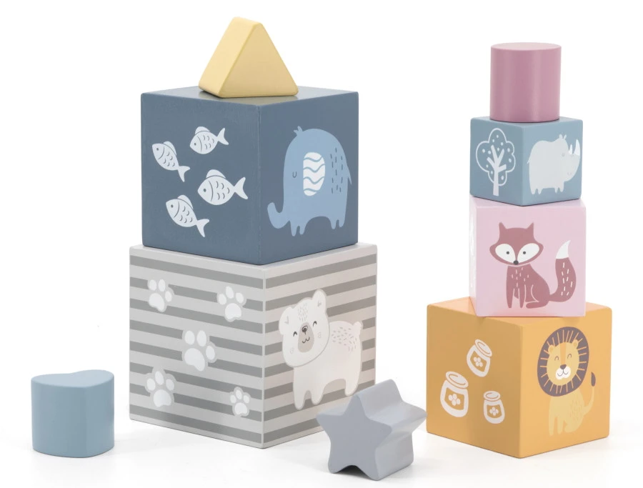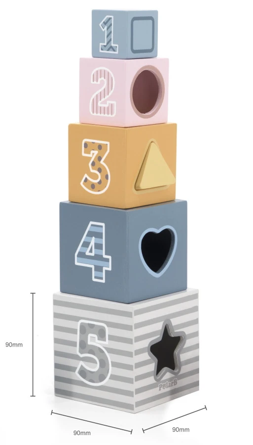 Kan jouw kleine deze kubussen opstapelen zonder de toren te laten vallen? Met de PolarB 2-in-1 houten stapelblokken en vormenstoof leert je kleintje spelenderwijs. De 5 kubussen hebben allemaal andere kleuren, figuurtjes en cijfers wat erg leuk is!