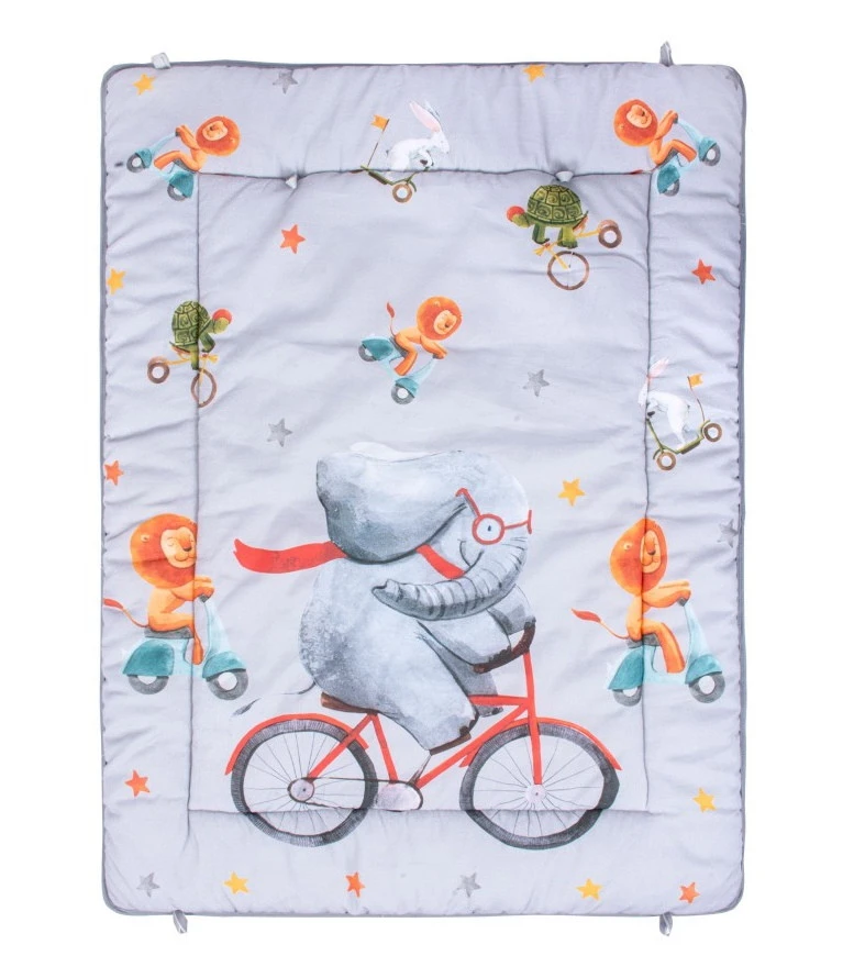 Het speelkleed is grijs van kleur met een lieve opdruk van verschillende diertjes.