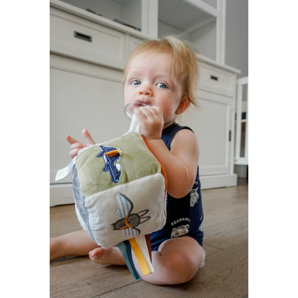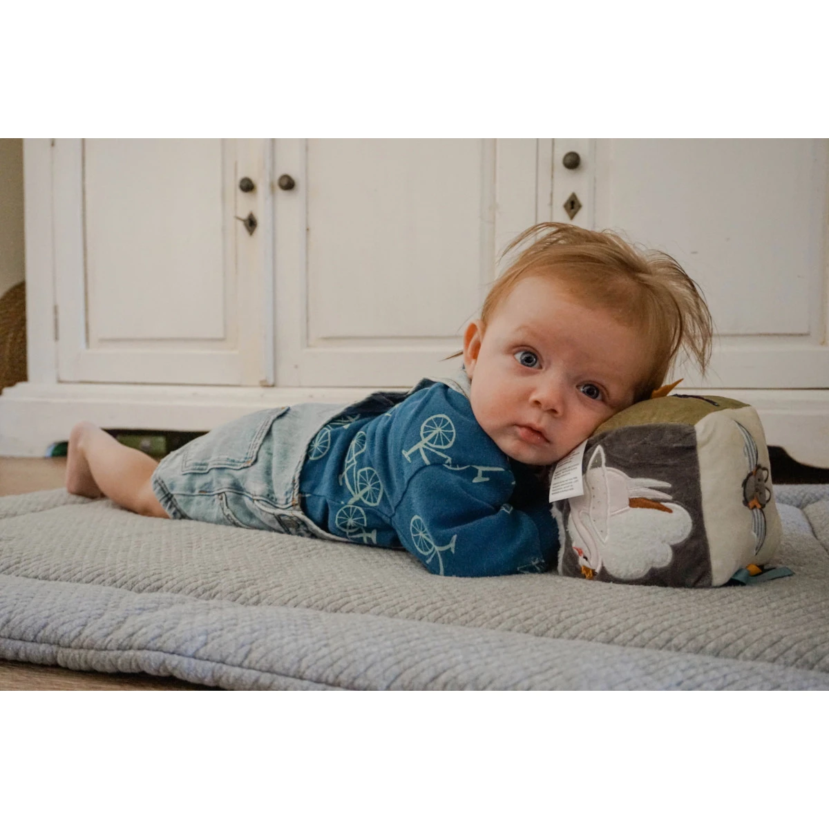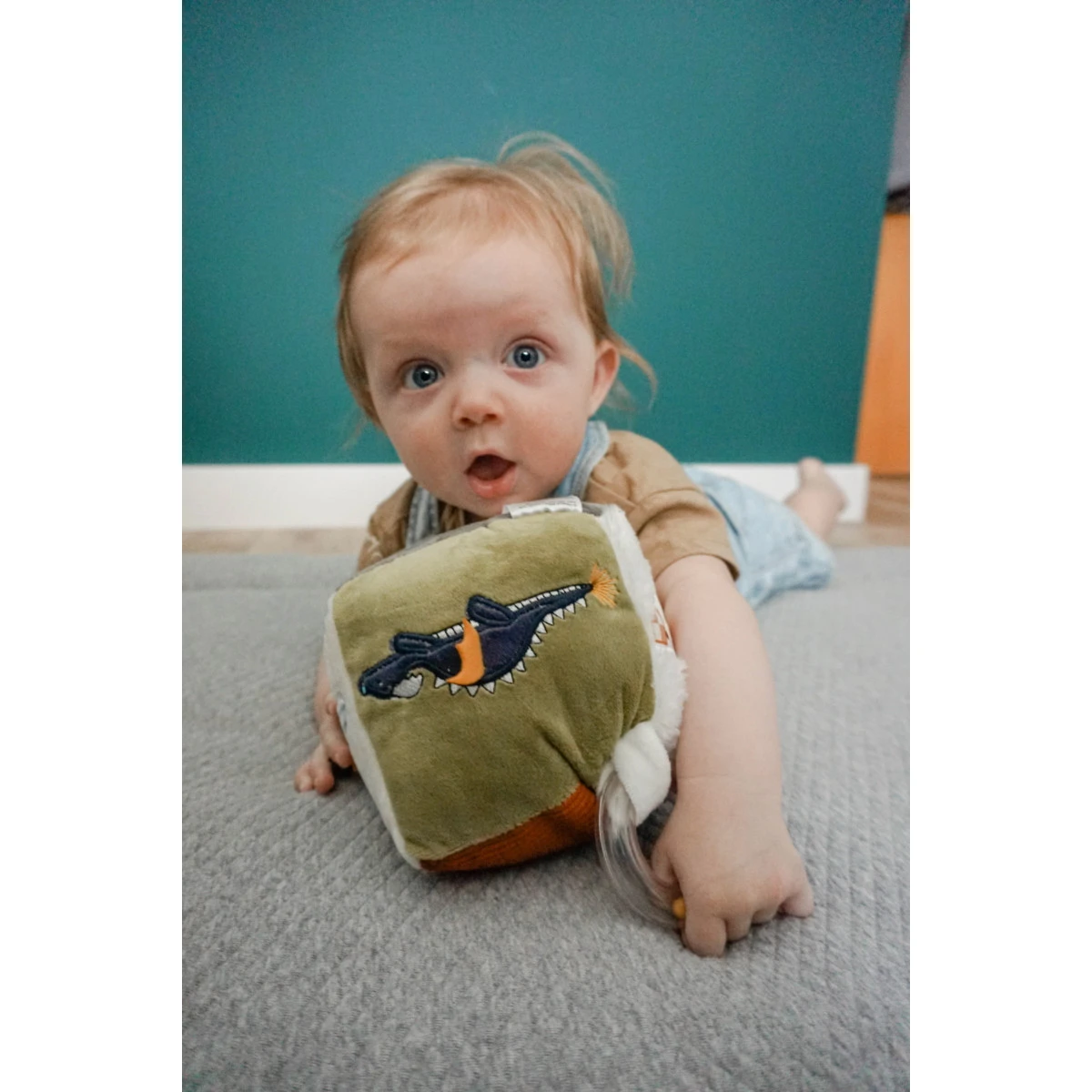 Zo heeft de kubus een rammelaar, verschillende labeltjes en een spiegel! Op iedere kant is er iets anders te ontdekken en beleven! Daarnaast is de kubus gemaakt van verschillende stoffen en structuren, waardoor je kindje verschillende structuren leert herkennen.