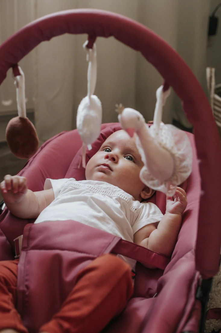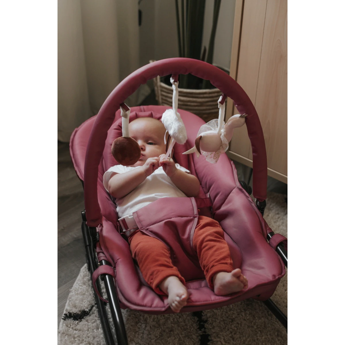 Je kindje hoeft zich niet te vervelen in de wipstoel, hij heeft namelijk een vrolijke (afneembare) speelboog met drie leuke speeltjes en Swan Ivy in de hoofdrol! De wipstoel heeft een schommelfunctie maar ook twee haakjes waarmee je hem vast kunt zetten, handig als je bijvoorbeeld je kindje eten wil geven in de stoel. De bouncer kun je gemakkelijk verplaatsen of meenemen dankzij de twee handvaten.