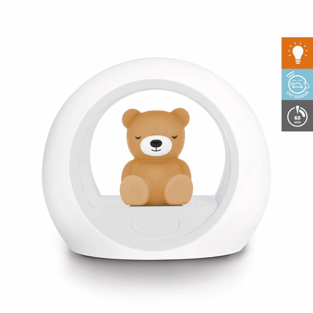 De geluidssensor zorgt ervoor dat wanneer je kleintje ’s nachts huilt, het beertje automatisch even aangaat zodat je kindje kan zien dat er niets aan de hand is en hij/zij nog steeds veilig thuis is. Als de rust weer terug is schakelt Billy zichzelf weer uit. Met de timer functie kun je instellen dat de ring rondom Billy na 30 minuten uitgaat en Billy zelf na 60 minuten. Ook de felheid is aan te passen zodat je hem tijdens het naar bed gaan lekker fel kunt zetten. Gaat je kleine slapen? Dan kan je het lichtje gemakkelijk dimmen.
